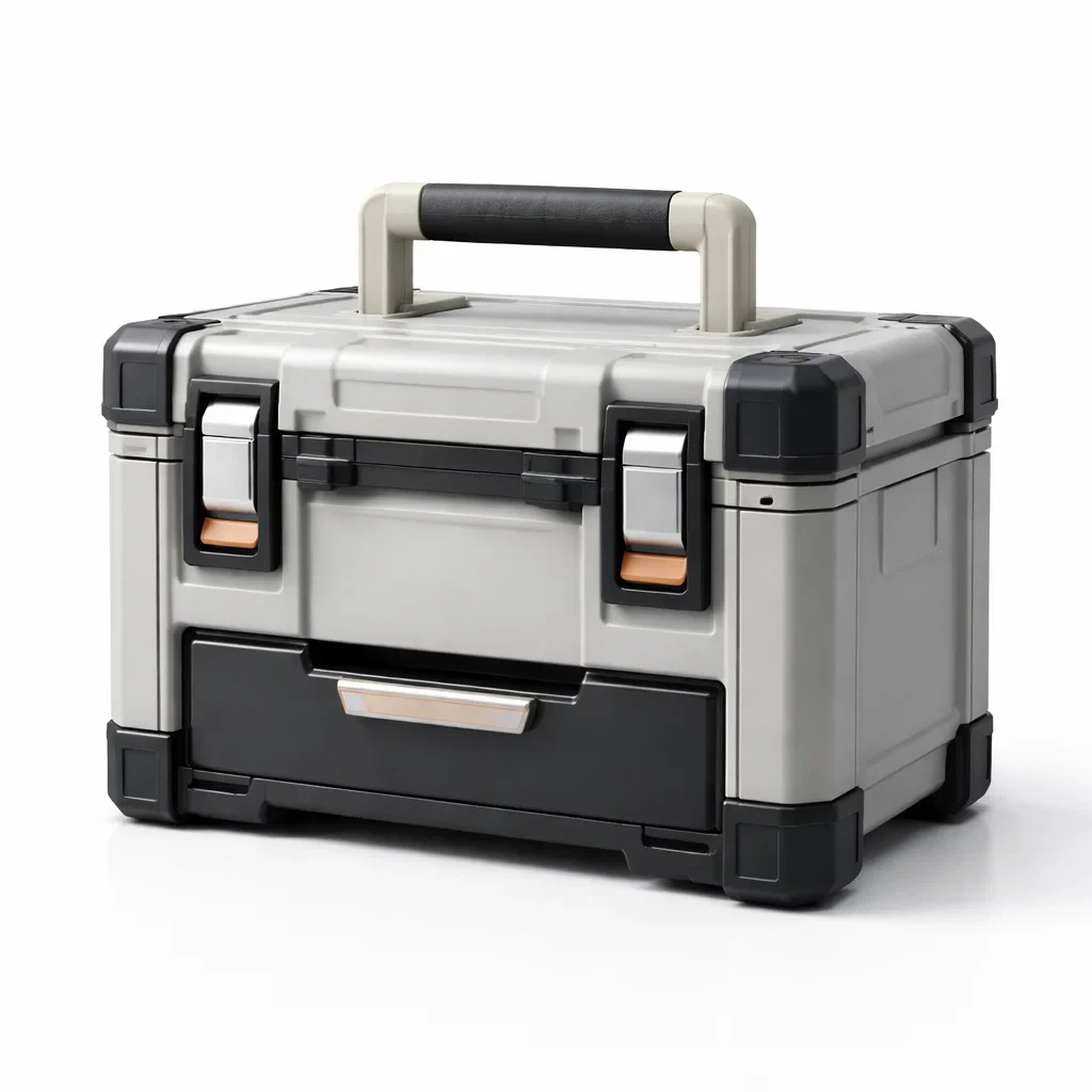 Boîte à outils rigide conçue en plastique ABS avec poignées métalliques, idéale pour le rangement et le transport d'outils divers.